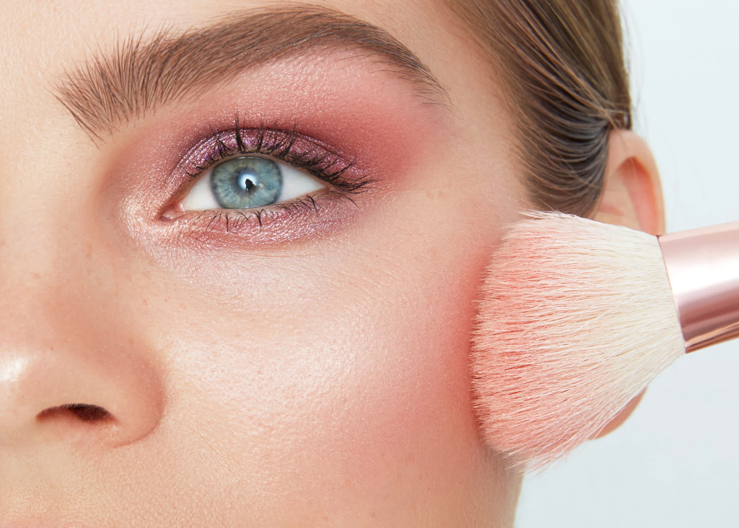 Strona główna Makijaż, który podkreśla naturalne piękno Close up beauty portrait of a woman applying pink blush with a fluffy makeup brush. Her blue eye is highlighted with shimmering eyeshadow, and her eyebrows are well-groomed.